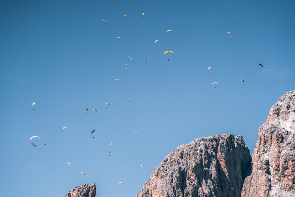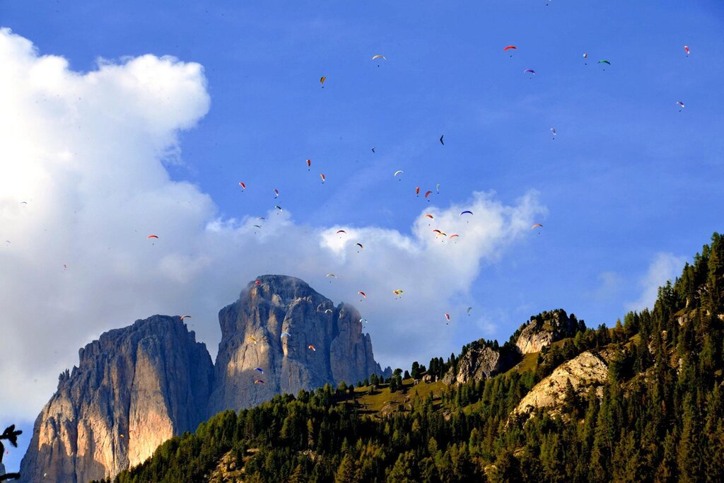 Gonfiare la vela sulle montagne più belle del mondo in Val di Fassa è un’esperienza indimenticabile. Alzarsi al di sopra delle nuvole, sorvolare il Sassopiatto, il Sassolungo, il Catinaccio o persino atterrare sulla Marmolada: tutto questo è possibile grazie alla mappatura del territorio e delle correnti, unita alle conoscenze e competenze dei professionisti che mettono la loro esperienza al servizio di appassionati provenienti da tutto il mondo. Tanti sono i punti di partenza e di atterraggio possibili tra le Dolomiti di Fassa, ma i preferiti sono il Col Rodella sopra Campitello e il Belvedere di Canazei, due stazioni panoramiche di straordinaria bellezza. In particolare, le giornate di fine settembre e inizio ottobre offrono condizioni di volo eccezionali grazie a un particolare microclima, favorito dall’alta pressione.