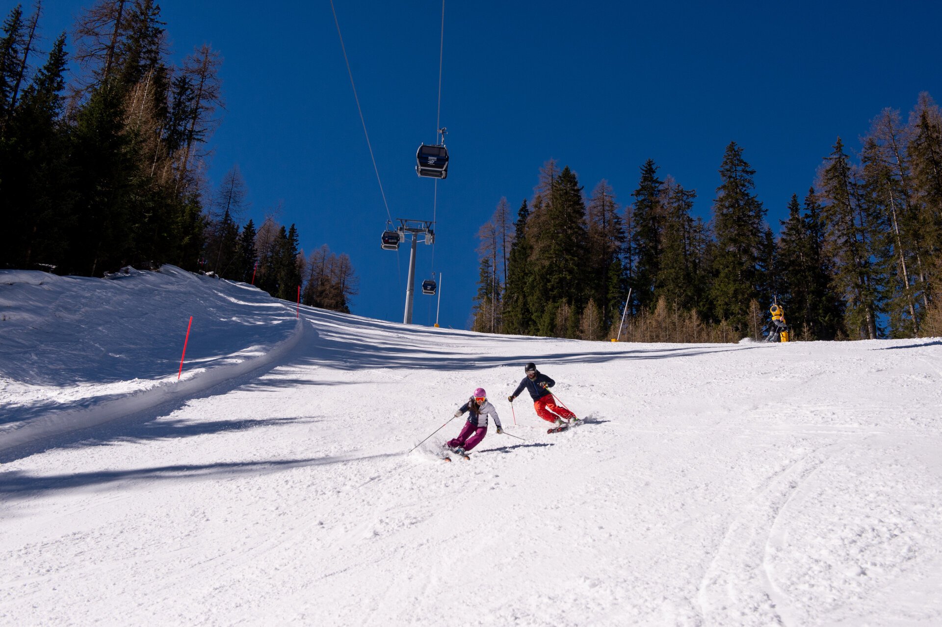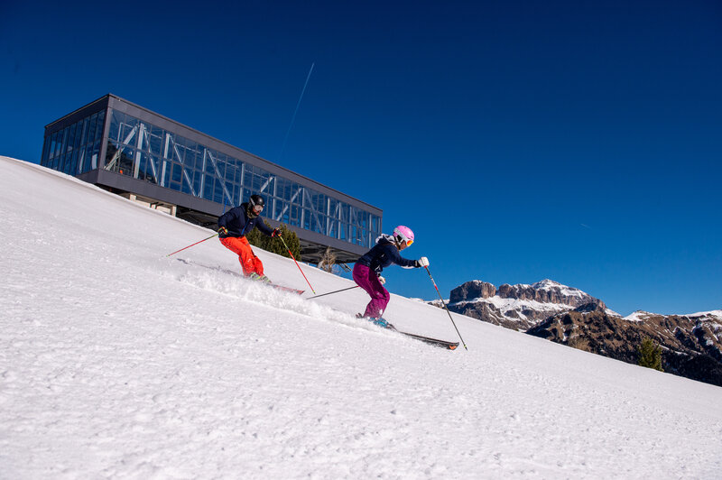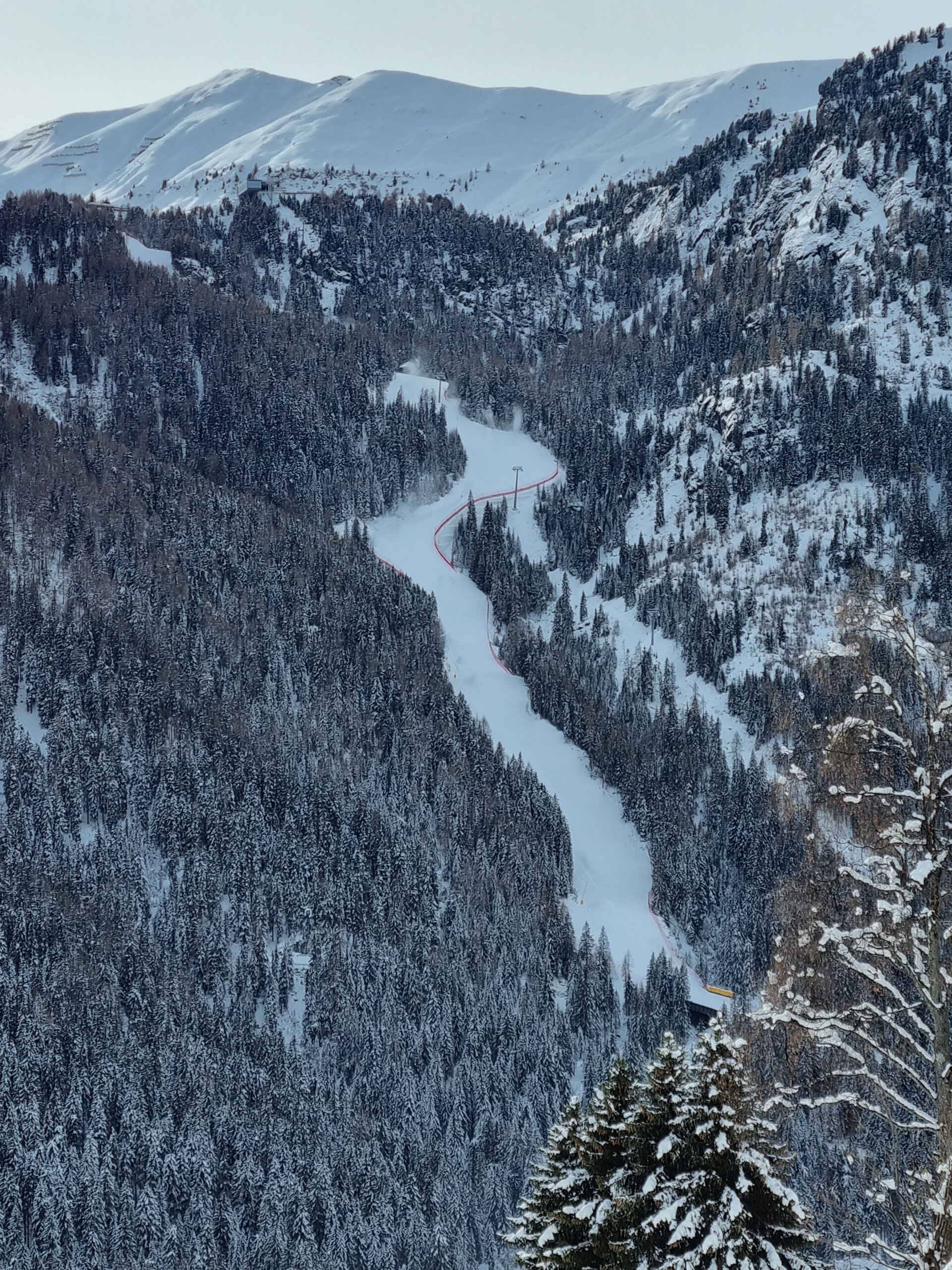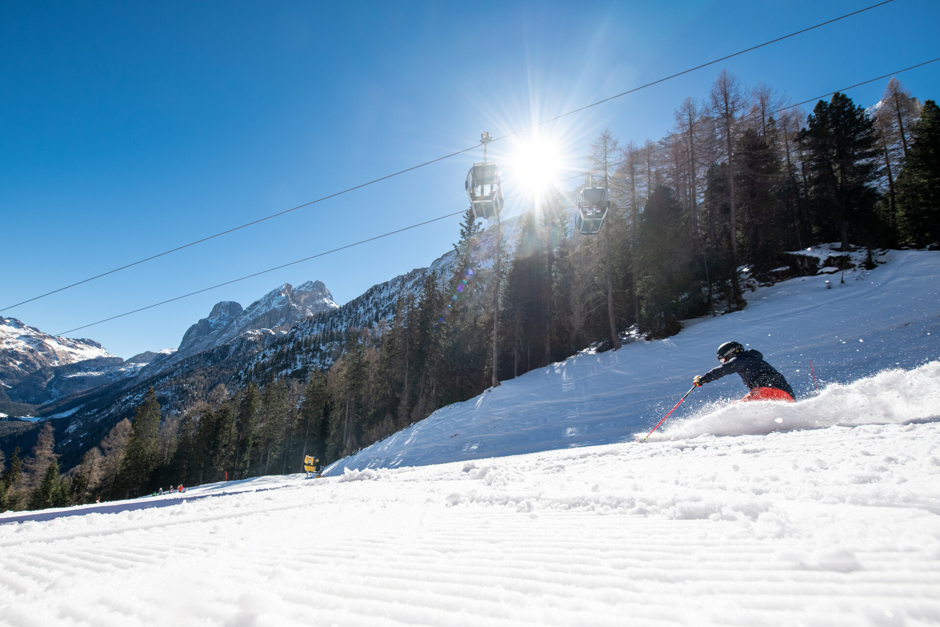 È fortissimo il richiamo di questa pista che, dopo l’abbraccio iniziale delle cime dal Piz Boè alla Crepa Neigra, si immerge in un serpentone nel bosco che scende quasi in picchiata fino ad Alba di Canazei. Sin dal primo muro capisci di che pasta - o meglio, neve - è fatta: prendi le misure, senti come il tuo corpo scivola, imprimendo la giusta pressione sulla neve, per superare pendenze fino al 56% e poi lasciati scivolare sul finale in un’ampia curva che esce dal bosco e porta agli impianti.
