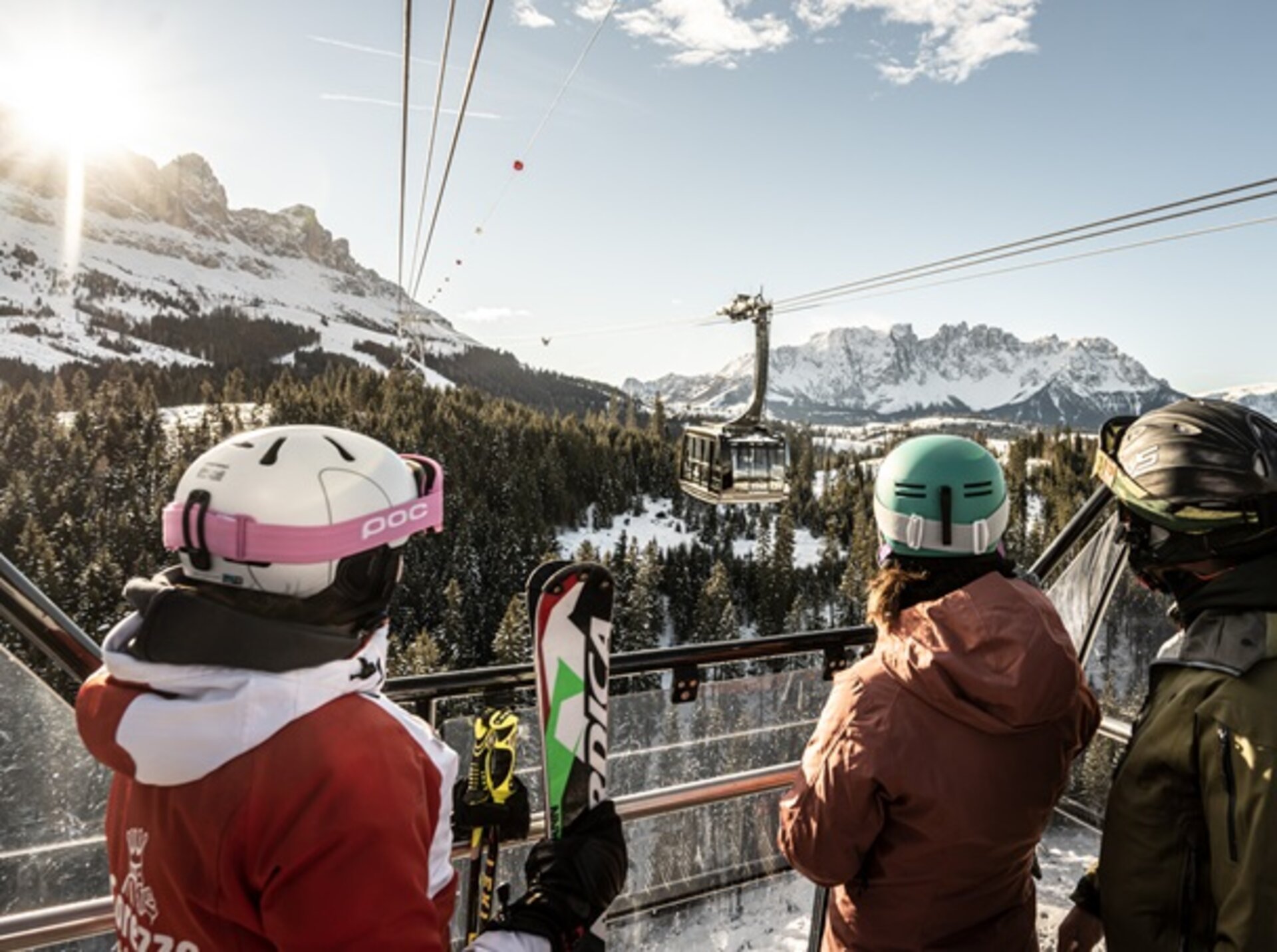 Un itinerario unico che abbraccia il gruppo del Catinaccio, regalando 35 km di piste e panorami sempre nuovi. Per scaldare le gambe, si comincia sulle piste della skiarea Carezza, per poi raggiungere in skibus Pozza e la cabinovia del Buffaure. Lo skitour Panorama guida, sci ai piedi, la traversata della Val di Fassa, collegando Buffaure → Ciampac → Belvedere → Col Rodella. Dal Passo Sella si scivola verso la Val Gardena, quindi si risale all’Alpe di Siusi. Da Siusi, con navetta, si rientra a Tires. La spettacolare funivia cabrio riporta infine al punto di partenza, sospesi sopra i boschi mentre il Catinaccio si accende dei colori caldi dell’Enrosadira.