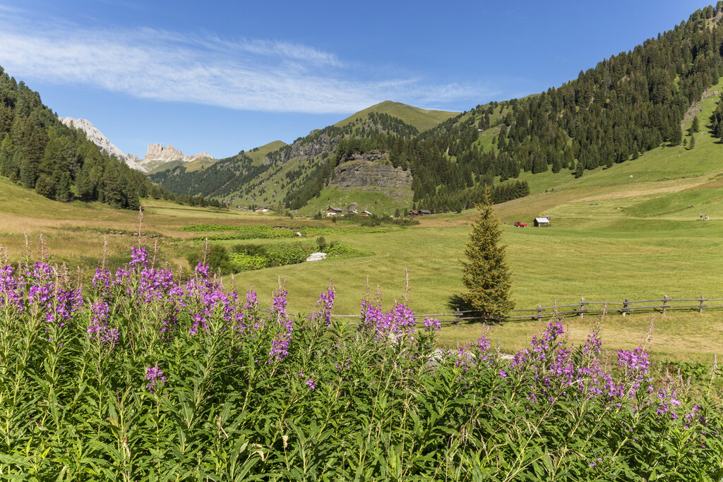 Da Campitello in Val Duron: uno splendido tappeto di erbe e fiori, disseminato di baite e rigato dalle acque cristalline del rio omonimo.