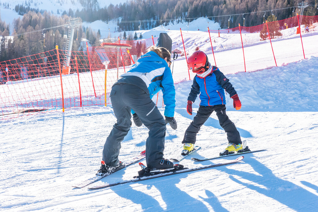 Le prime scivolate si compiono nei campi scuola all’Alpe Lusia (3.5 km da Moena) o al Passo San Pellegrino (11 km da Moena), facilmente raggiungibili anche da familiari/accompagnatori non sciatori.