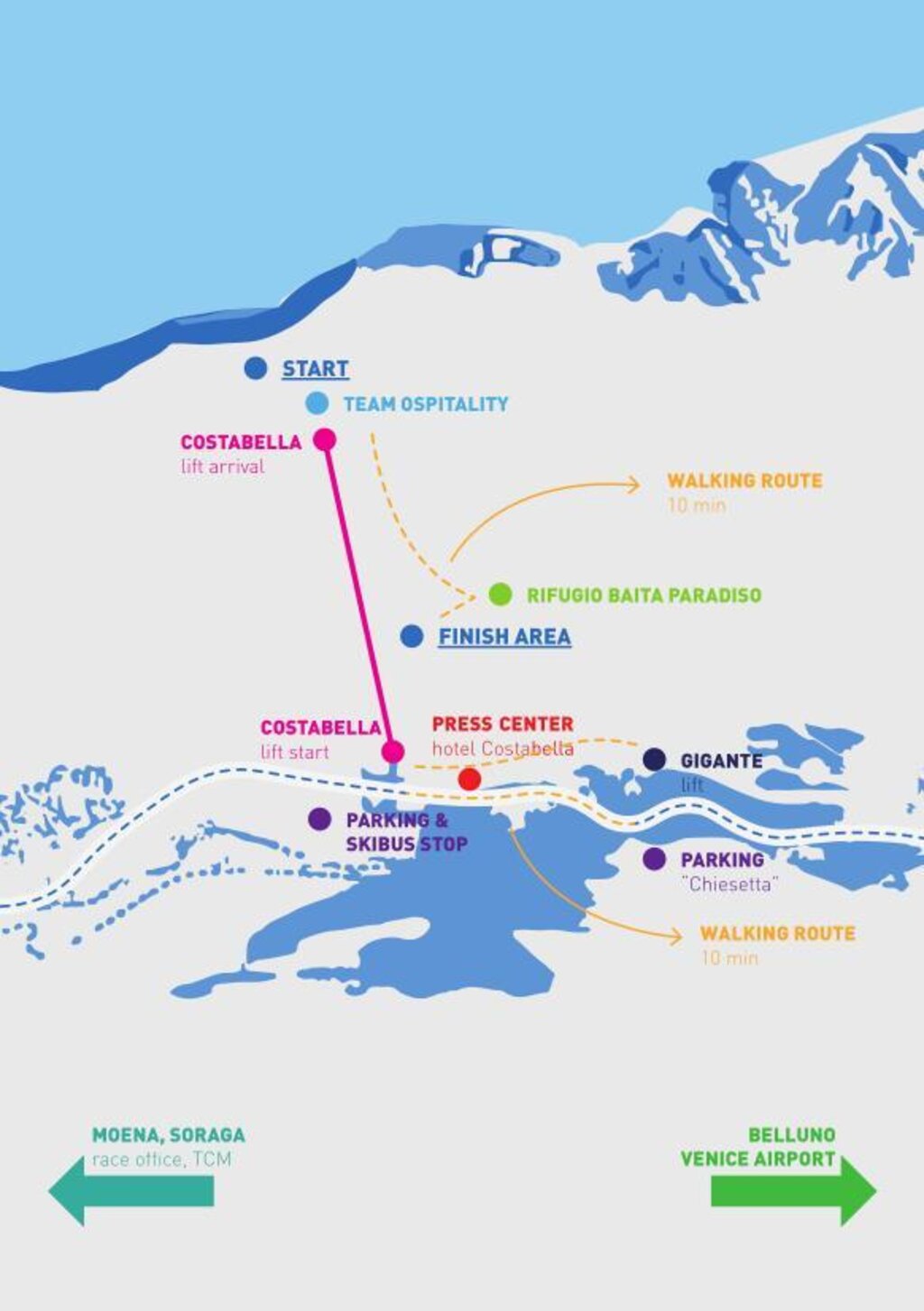 Gli spettatori potranno raggiungere la zona gara salendo in quota con la seggiovia quadriposto carenata Costabella, direttamente dal Passo San Pellegrino. Anche chi non scia potrà assistere alla competizione: dalla stazione a monte è possibile scendere a piedi lungo un percorso dedicato, che conduce fino alla zona traguardo, situata 600 metri più a valle, ai margini del tracciato. Per le giornate di venerdì e sabato è previsto un biglietto promozionale.